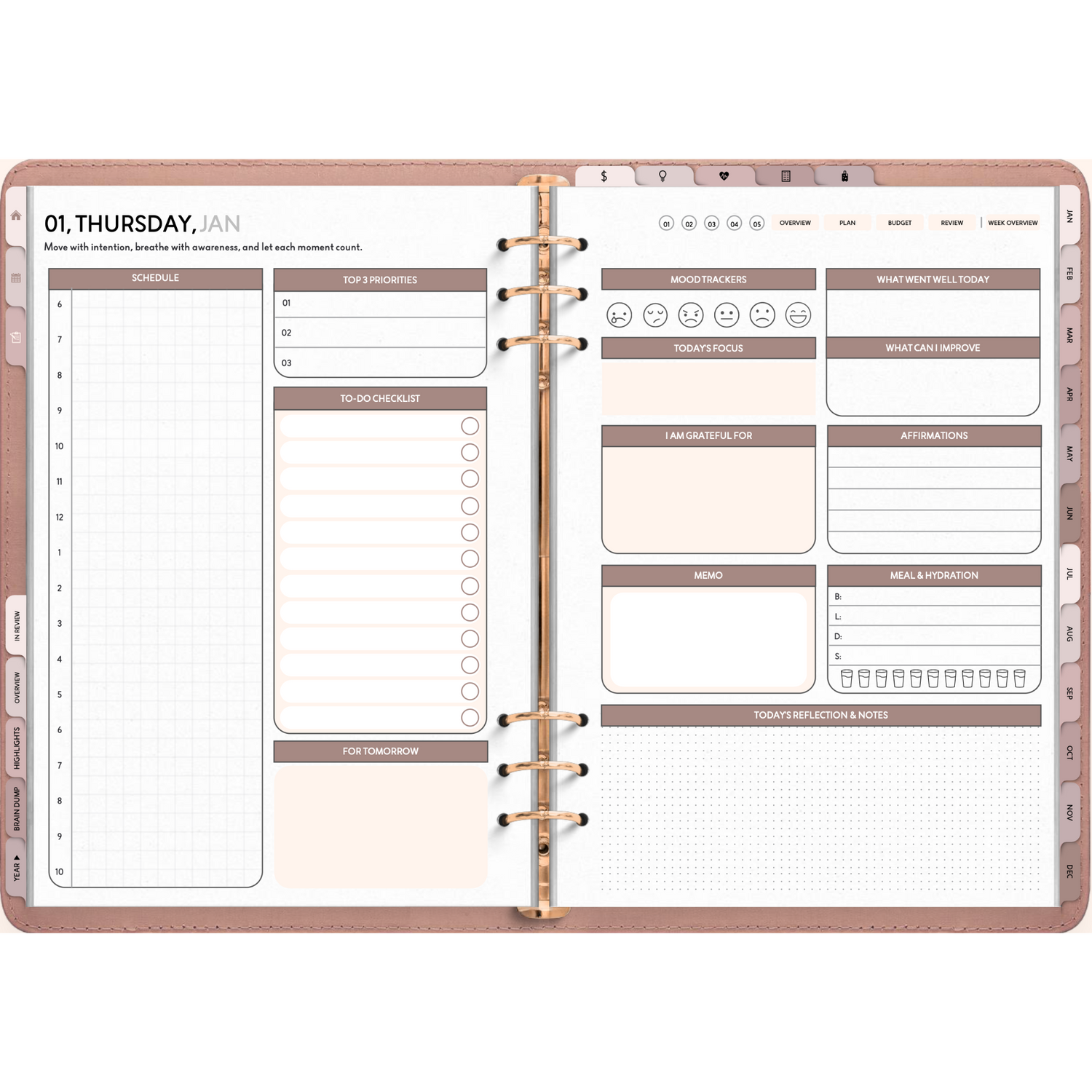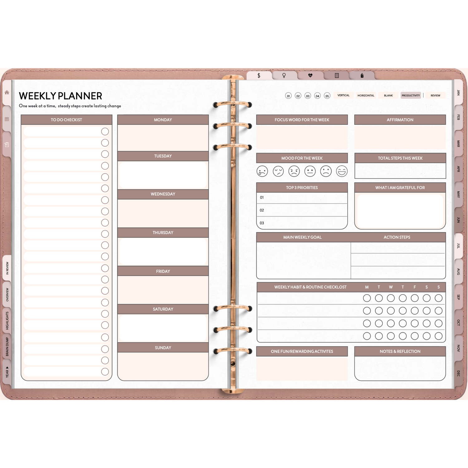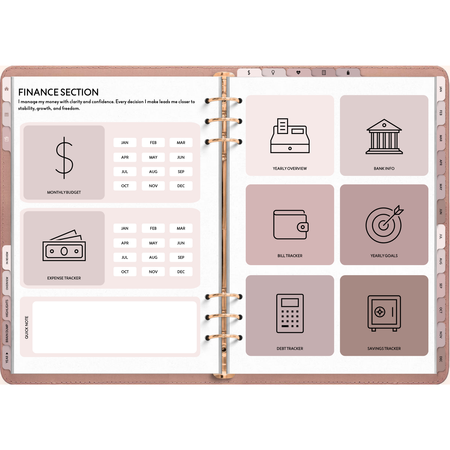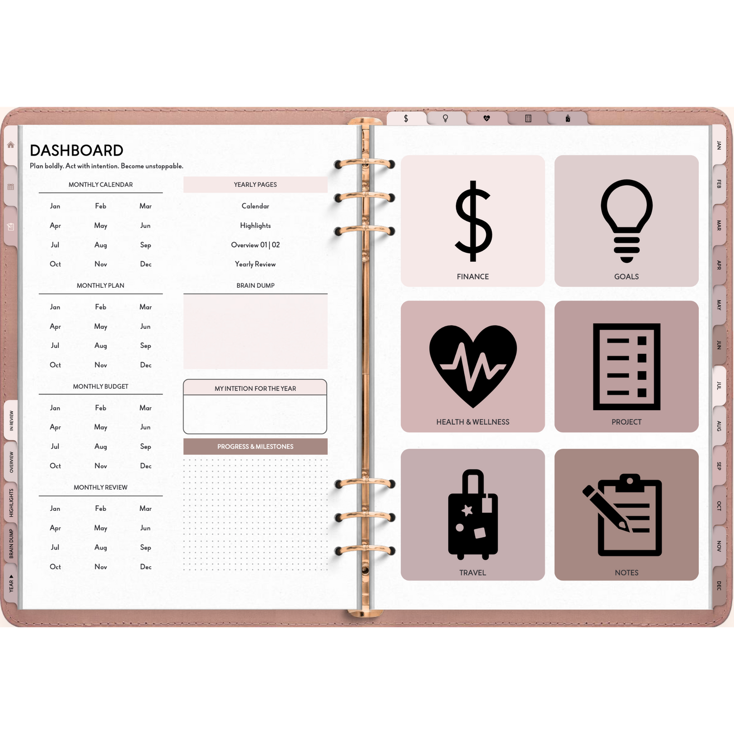 Hyperlinked tabs allow you to move seamlessly between yearly goals, daily planning, finances, wellness, and projects.