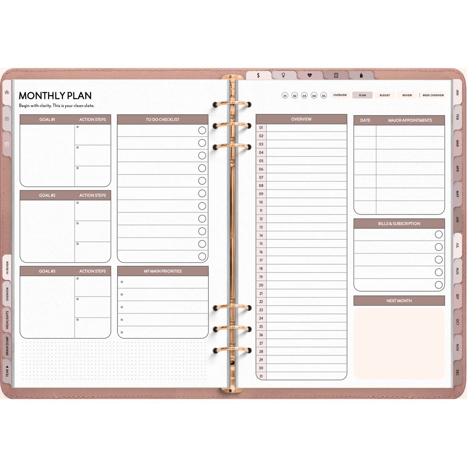 Each month includes a complete planning system with calendar views, budgeting tools, and reflection pages.