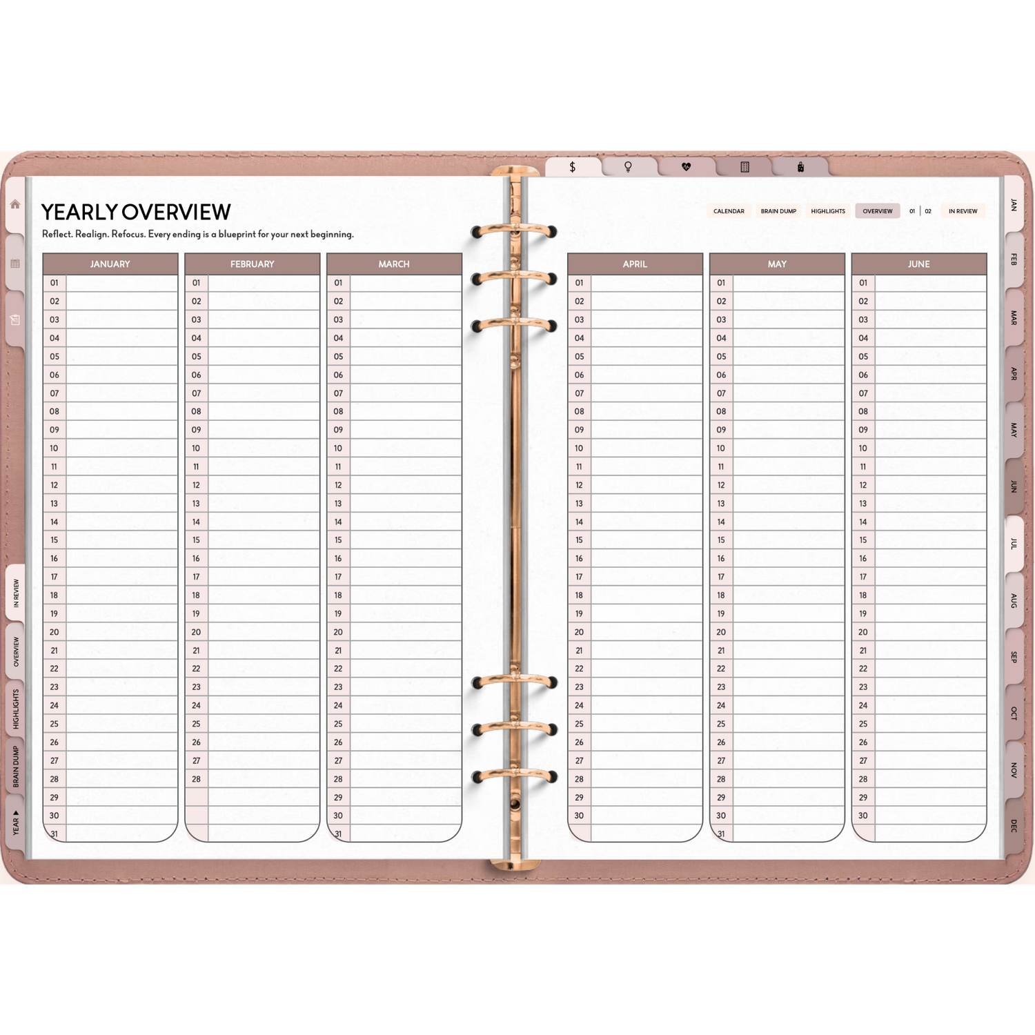 Plan your year with intention using structured yearly overviews and goal-setting pages.